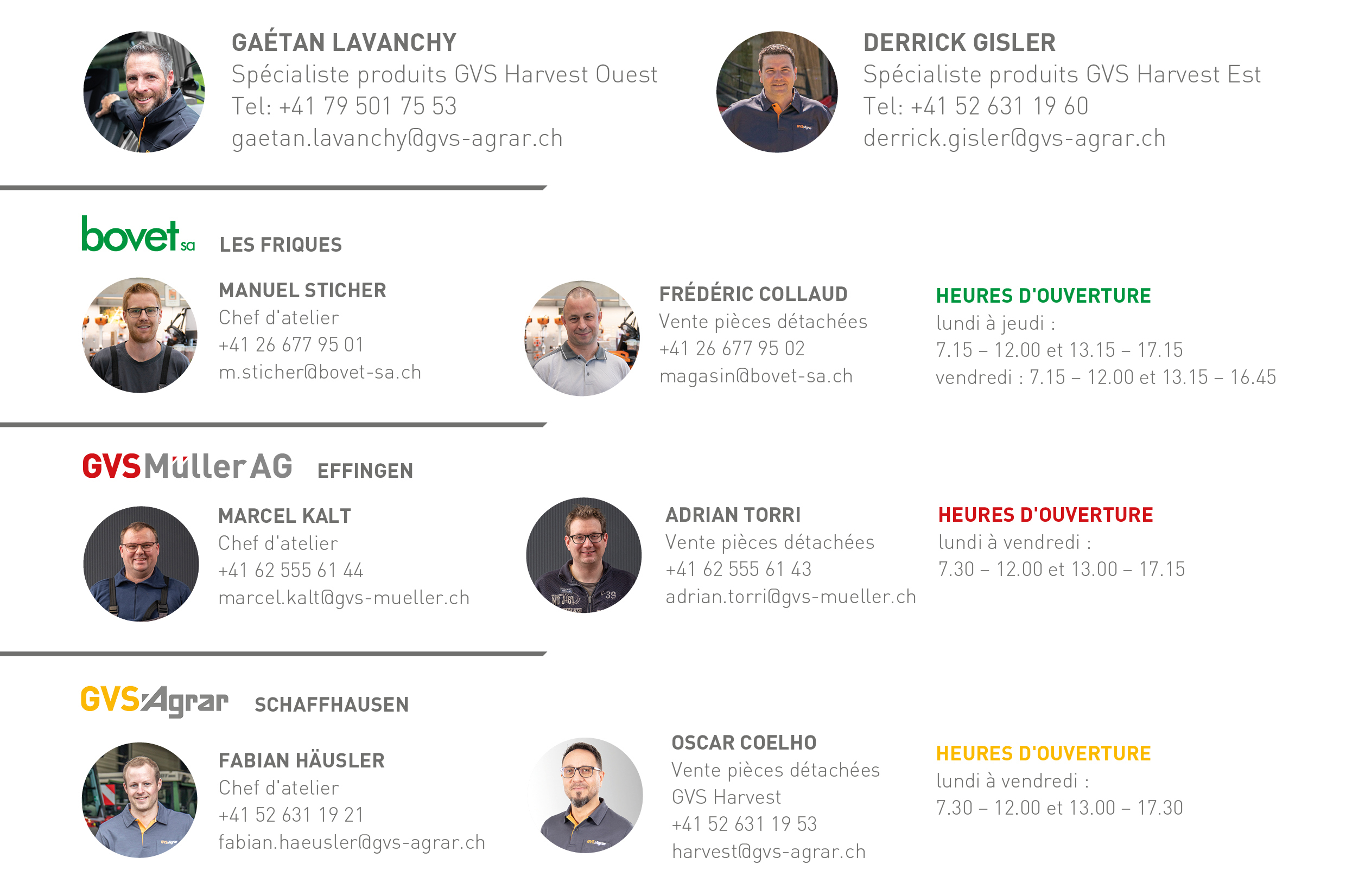 Des points de contact pour service et des pièces détachées, bien réparti sur le territoir Suisse, offrent le meilleur service pour moissonneuses-batteuses, presses à balles carrées,